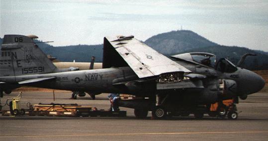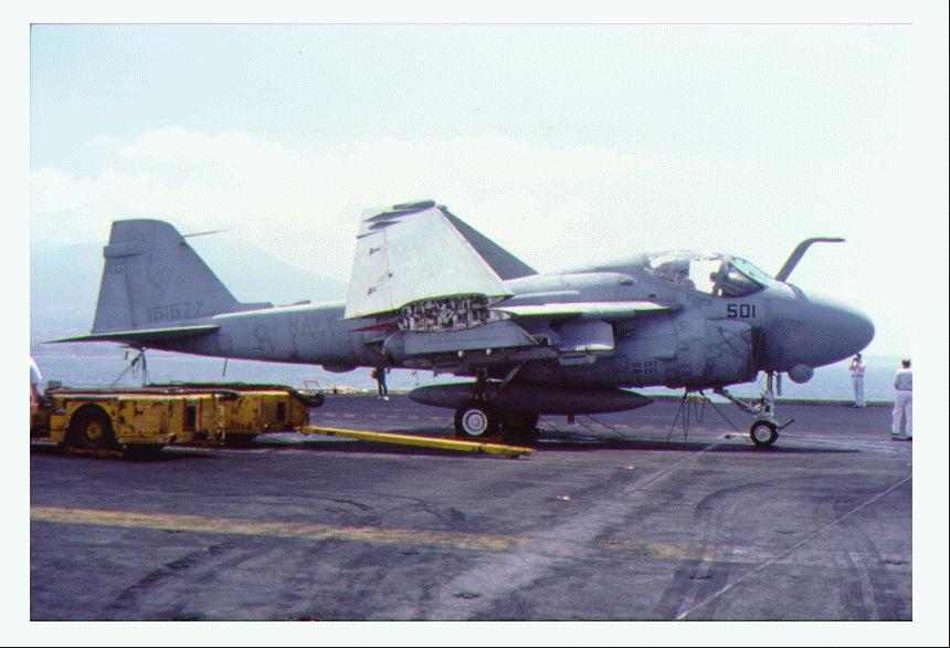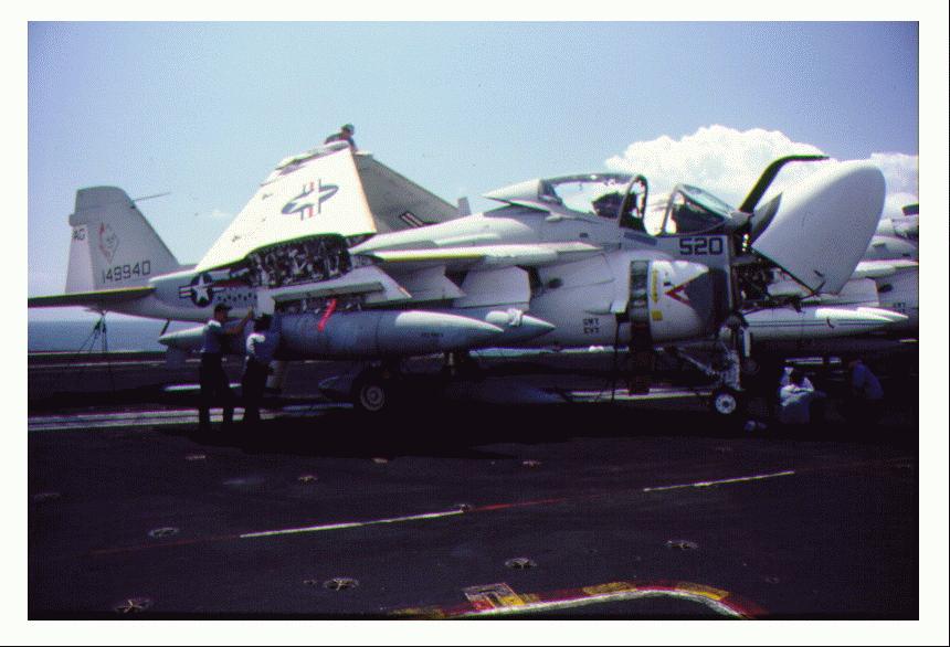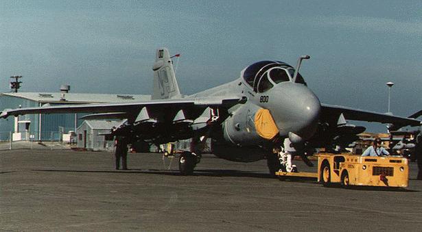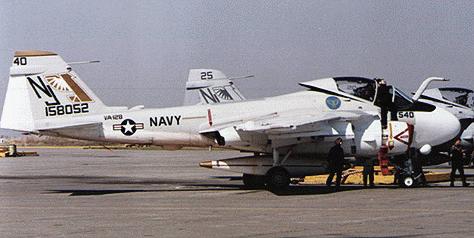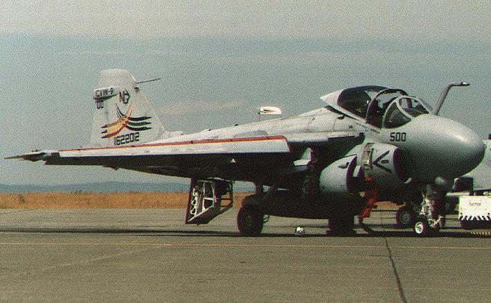 The A-6 Intruder is one of the most charismatic aircraft to ever enter US Navy service. While no one would call it classically beautiful, it has earned a place in the hearts of many Naval Aviators. First flown by VA-75 "The Sunday Punchers" in 1963 it is very fast approaching the end of it's Navy career. The last two squadrons, VA-196 "Main Battery" and VA-75, will both disestablish on the 28th of February 1997, leaving the Navy with no dedicated attack airframe in the inventory. Although no one denies the F/A-18's multi-role capablities will in part fill the gap left by the A-6 there will be no true replacement of the Intruder, the Navy having decided that its capabilites are no longer needed or affordable.