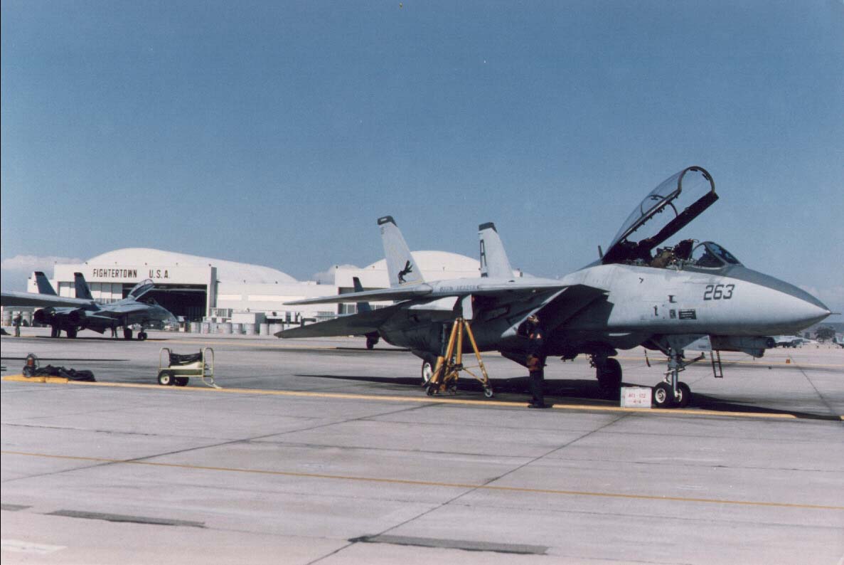 F-14A-135-GR BuNo.162589 Image Courtesy of Phillip Hino VF-101 aircraft marked up in memory of VF-21 Freelancers. Present at the NAS Miramar realignment ceremony, when NAS Miramar became MCAS Miramar, in July 1996.