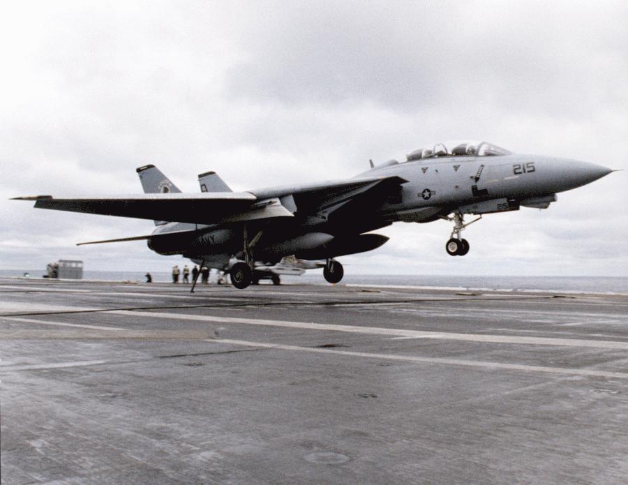 Tophatter's F-14A landing on USS John F. Kennedy (CV-67) during their 1996 cruise.