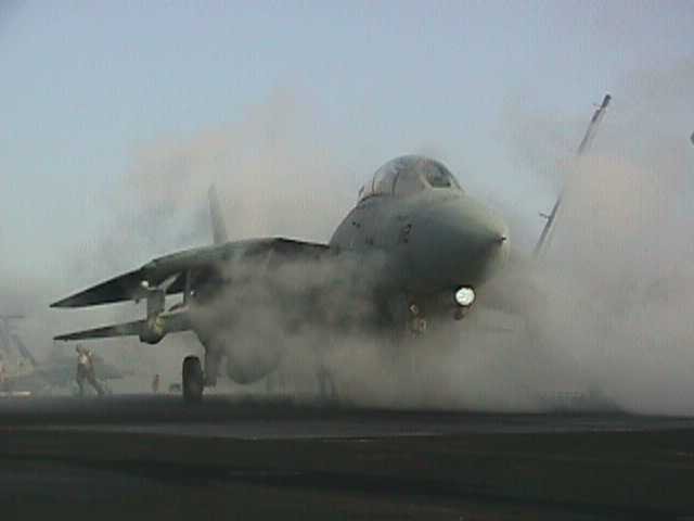 U.S.Navy Photo, Courtesy of VF-154. Lining up, wreathed in the steam of the last cat shot. Persian Gulf, early 1998, during Indy's last operational cruise.