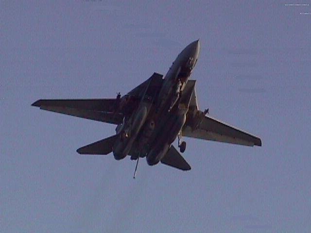 U.S.Navy Photo, Courtesy of VF-154. Coming in over the fantail, complete with TARPS pod. Persian Gulf, early 1998, during Indy's last operational cruise.