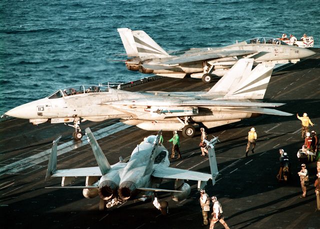 VF-154 Tomcats are marshalled round the deck of USS Kitty Hawk, during early 99.
