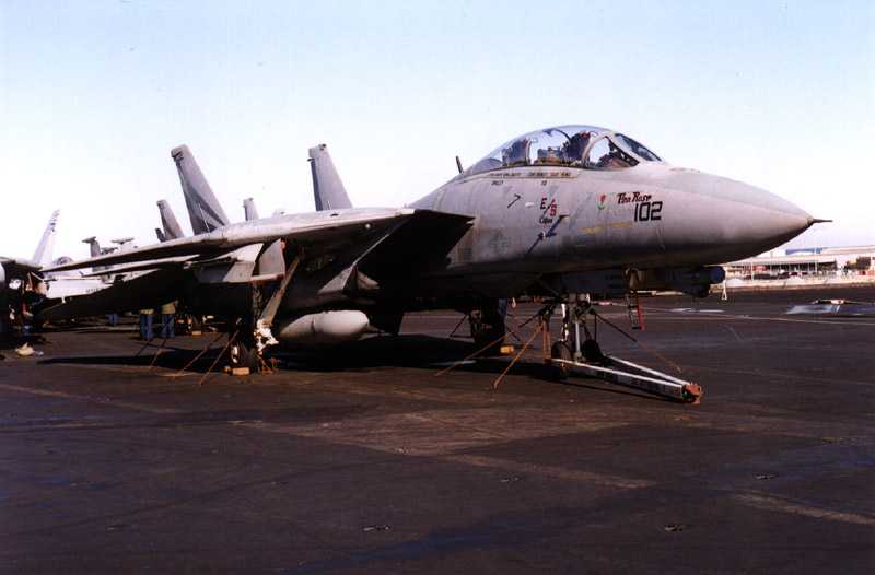 Image Copyright Rodger Kelly. NF102 (Tina Rose) sits chained to the deck of USS Kitty Hawk, CV-63, early August 1999, Perth harbour.