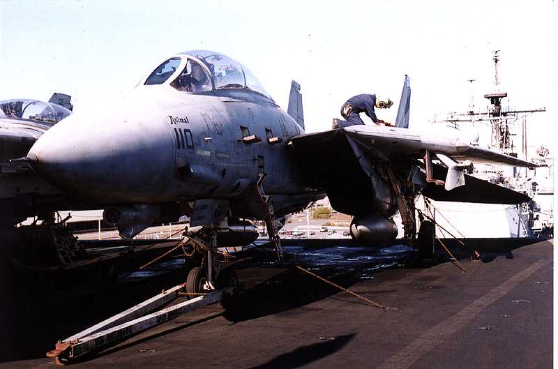 Image Copyright Rodger Kelly. NF110 (Animal) undergoes work while sitting on the fantail of USS Kitty Hawk, CV-63. The carrier was berthed in Perth harbour, early August 1999.