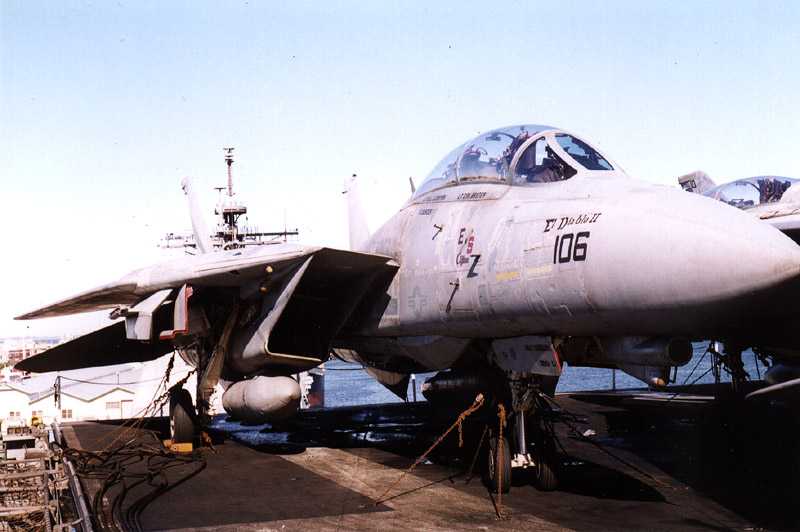 Image Copyright Rodger Kelly. NF106 (El Diablo II) sits on the bottom right corner of Kitty Hawk's flight deck, CV-63. The carrier was berthed in Perth harbour, early August 1999.