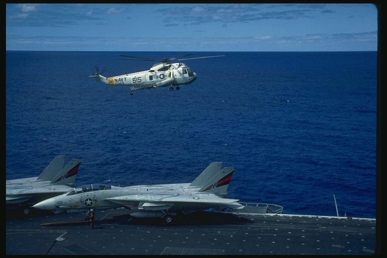 Image Courtesy of the Integrated Security Systems Page A pair of VF-154 F-14's wait on the flight deck of USS Constellation (CV-64) while the plane guard SH-3 hovers nearby.