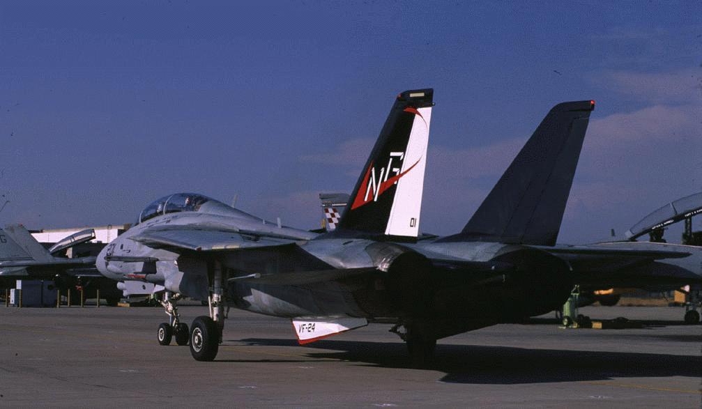 Image Courtesy of Brian Plescia Copies may be purchased from Brian. Rear view of 'NG201'. In the background can be seen one of VF-211's colourful aircraft, painted in a scheme reminiscent of their 1970's markings.
