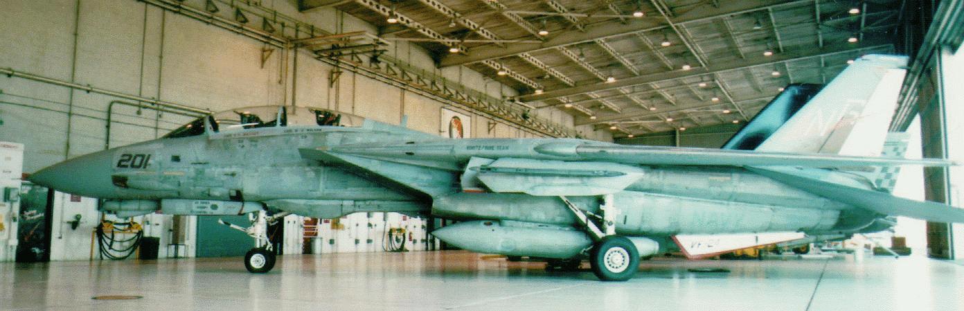 F-14A from VF-24 just prior to the squadron's disestablishment. To celebrate their last months of operation VF-24 painted this jet in a similar scheme to that worn by their 1970's aircraft. This aircraft took part in the 1996 airshow at NAS Miramar and was flown to the NSFWS at NAS Fallon the following day.