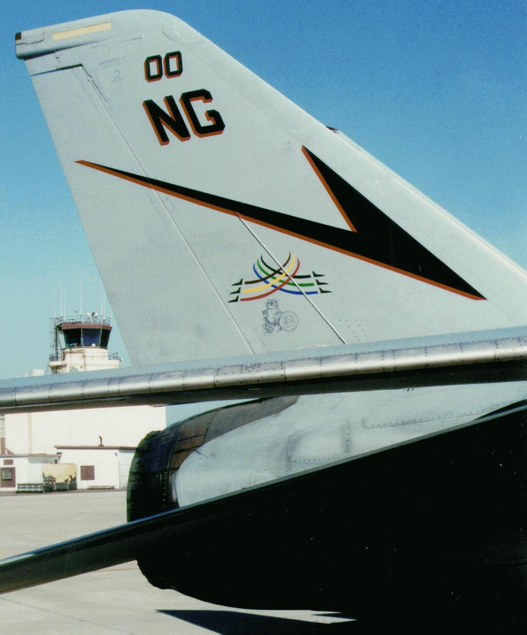 'NG200'. Taken before VF-24's last cruise this was the CO's aircraft. The Tomcat logo is applied at the NAD Norfolk, when aircraft are repainted after major overhaul and contains information on the finshes used. It's presence here suggests the aircraft has only recently returned from overhaul.