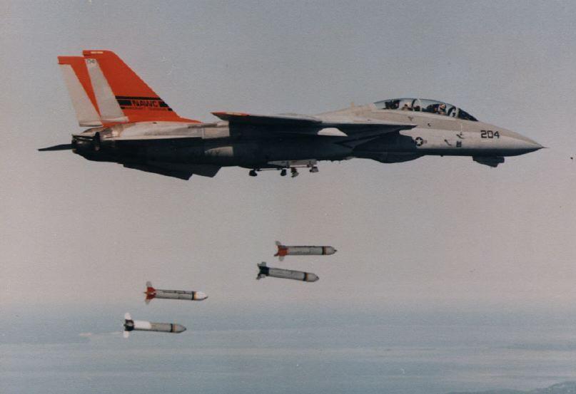 U.S. Navy Photo, Courtesy of Mike Burgoyne Mk 20 CBU cannisters fall from the underfuselage hardpoints of a F-14A. The pop out wings on the Mk 20s have already deployed.