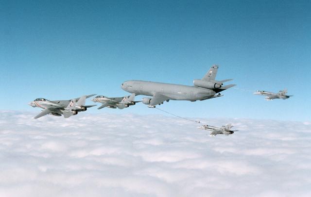 2 VF-102 F-14B "Update" formate with F/A-18C's and a KC-10 over the Persian Gulf in late 1997.