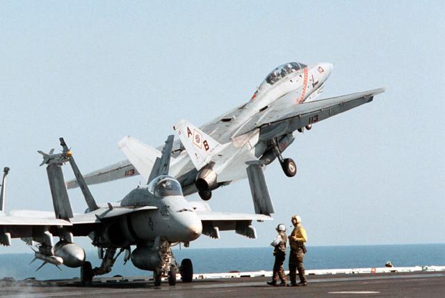 Spectacular take off by a Diamondbacks F-14B during their 1997/98 cruise. Mid-February1997, Persian Gulf.