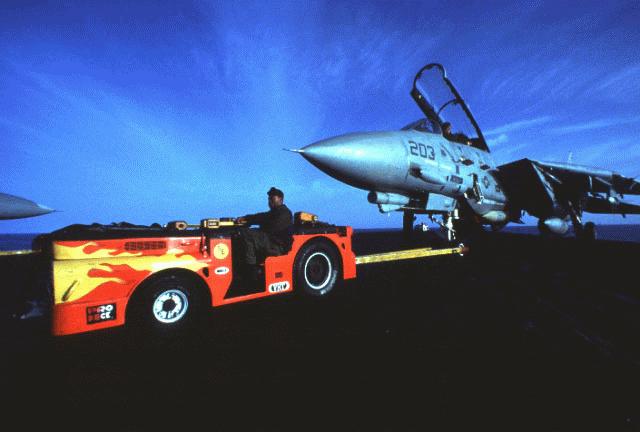 Image Courtesy of the Integrated Security Systems Page U.S. Navy Photo F-14B of VF-103 Sluggers is manoeuvered on USS Saratoga's deck during the 1991 Gulf War.
