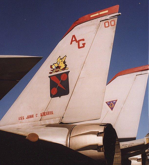Image Courtesy Terry Ashley. F-14B-155-GR BuNo. 163410 Close up of VF-11 CAG bird tail markings. A CVW-7 insignia is on the inside tails.