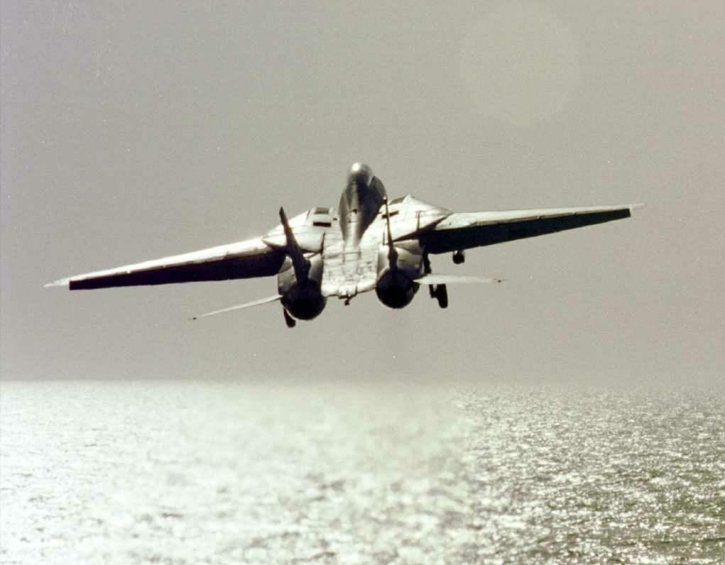 With a LANTIRN pod underwing a Dog F-14B rises into the sky.