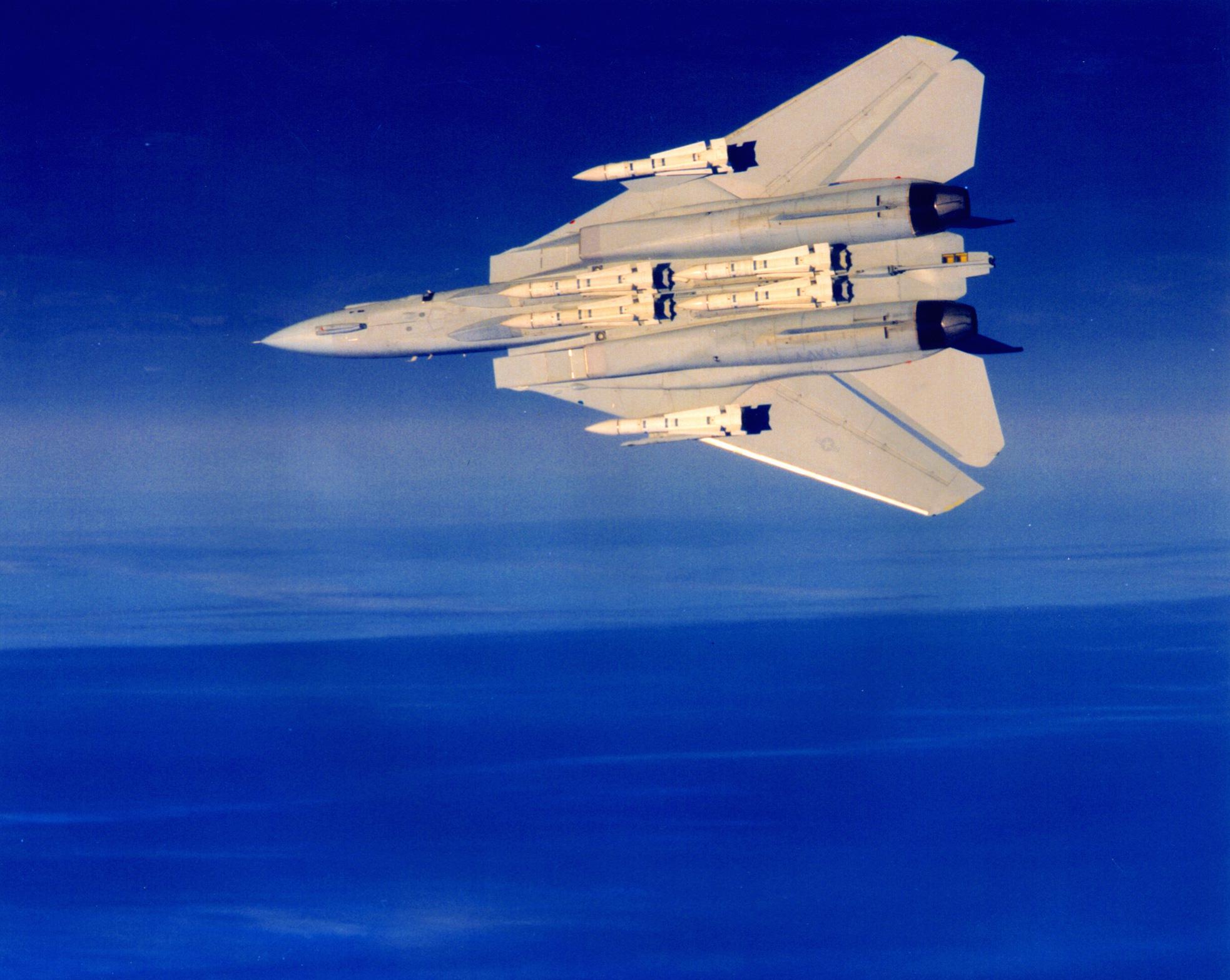 On a photo hop this VF-211 F-14B pulls away to show six AIM-54training rounds.