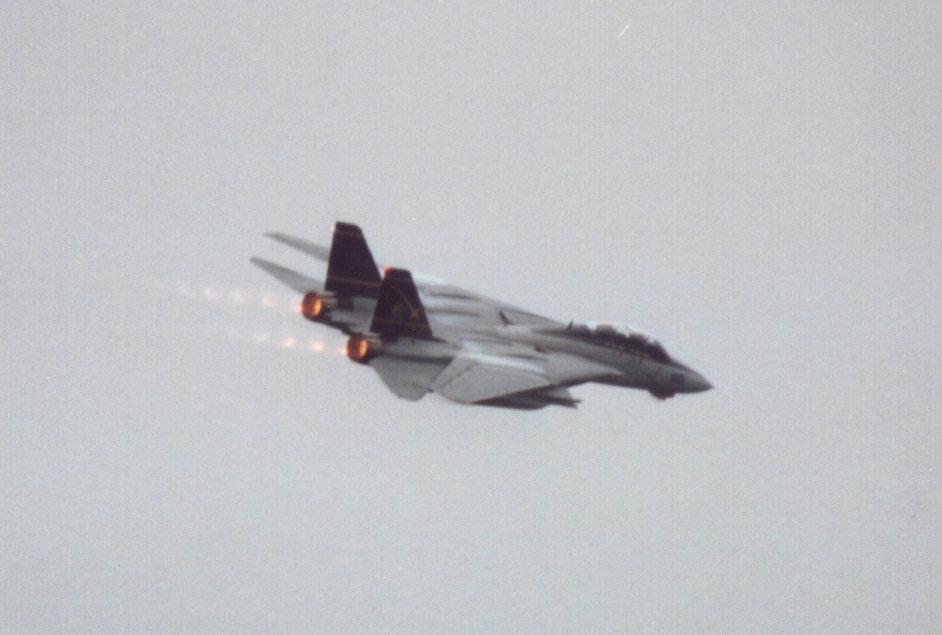 Image Courtesy of Dennis Johnson 'AC200', VF-32's CAG bird, does a high speed, low-level pass over USS Enterprise (CVN-65) in October 1997.