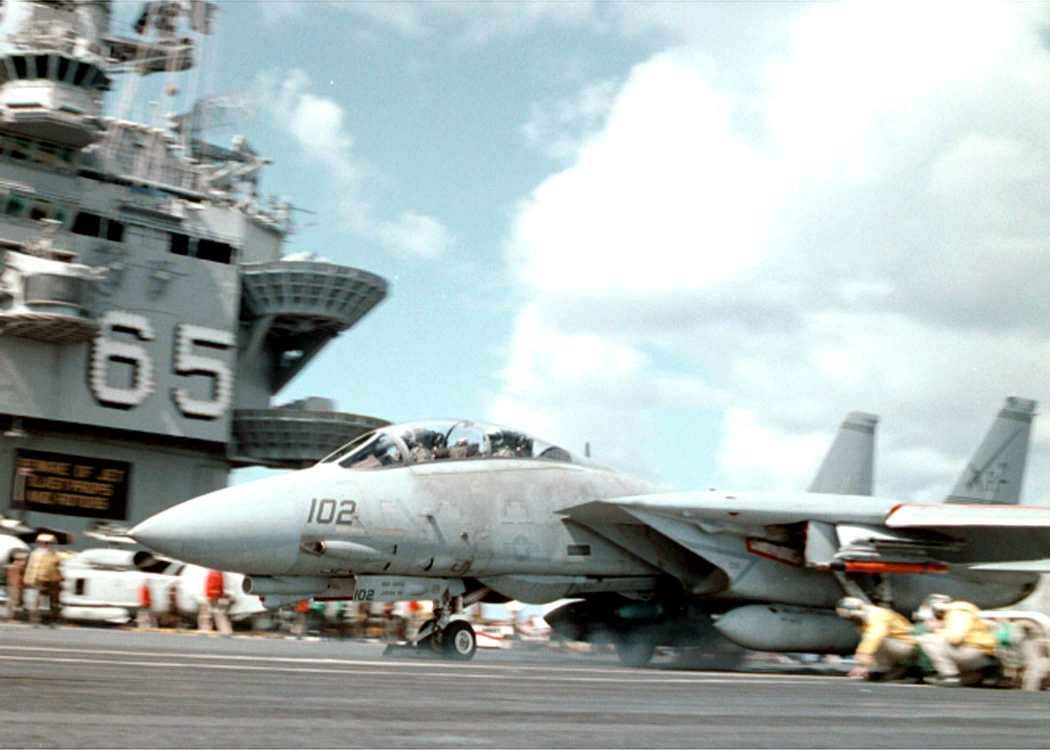 US Navy Photo AC102 launches down the cat onboard USS Enterprise, CVN-65, late 1998. The aircraft is carrying a TACTS pod and dumb bombs.