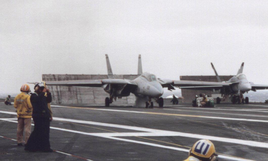 Image Courtesy of Dennis Johnson 'AC102' launching from USS Enterprise in October 1997. The puff of steam indicates the aircraft has just started to rush down the 'cat.