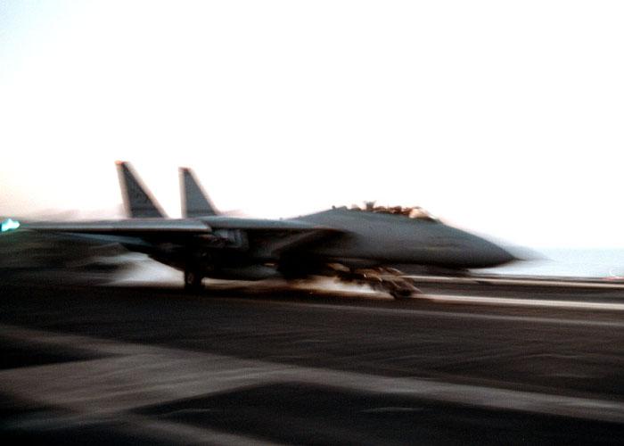 US Navy Photo The F-14B turns to a blur as it launches from USS Enterprise on another Desert Fox mission, December 1998.