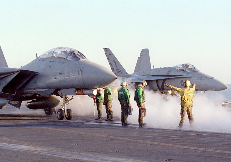 US Navy Photo Blacklion F-14D lines up alongside a VFA-22 F/A-18C on the flight deck of USS Carl Vinson (CVN-70), early 1999.