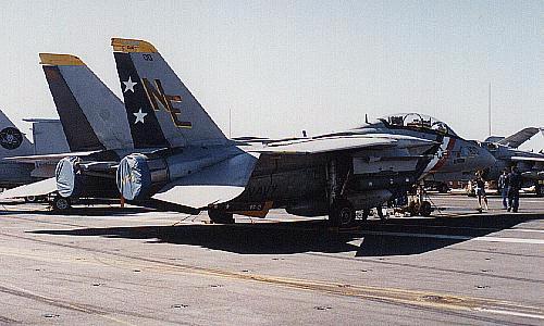 Rear view of Bullet '100' (BuNo. 163895). On the wing glove pylon is a LANTIRN pod. Onboard USS Constellation (CV-64) during a 1997 port visit to Australia.