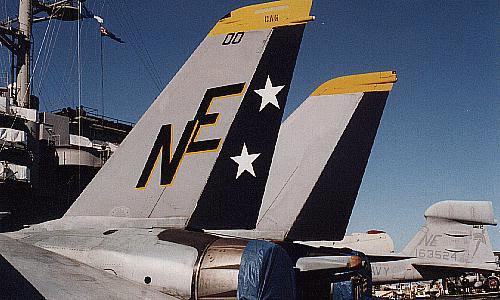 Close up of the tail markings of Bullet '100' (BuNo.163895) onboard USS Constellation during the 1997 cruise.