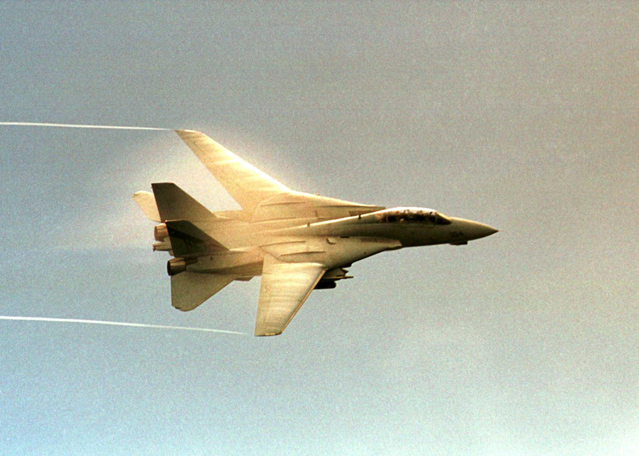 US Navy Photo Vapour streams from the wings of Bullet 104 as it is lit golden by the setting sun. Taken during the 1999 cruise onboard USS Constellation (CV-64).