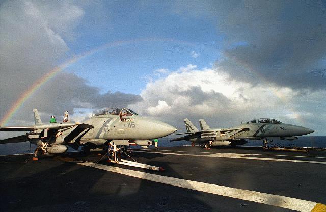 Two F-14D's of VF-2 onboard the USS Constellation (CV-64) during its 1997 WestPac cruise. The aircraft furthest from camera has a LANTIRN pod fitted on the underwing pylon. VF-2 were the first Pacific Fleet squadron to take LANTIRN on cruise.