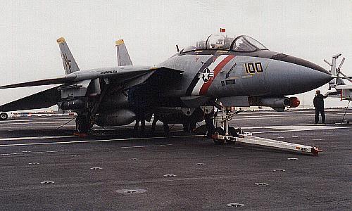View of Bullet '100' (BuNo. 163895), the CAG aircraft, wearing full colour squadron markings. As well as a LANTIRN pod under the right wing glove this aircraft is fitted with drop tanks and a tow bar attached to the nose undercarriage. Also interesting is that the rear portions of the Phoenix pylons are lowered, as they would be in order to attach bombs or missiles.