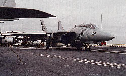 Bullet '104' (BuNo.161163) on the deck of USS Constellation (CV-64) during a port visit to Australia as part of her 1997 WestPac cruise. Both the TCS and IRST in the undernose pod are covered to prevent damage.