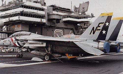 Rear view of Bullet '100' (BuNo. 163895) showing the full colour markings to good effect. Photo taken onboard USS Constellation (CV-64) during the carrier's visit to Australia in 1997.