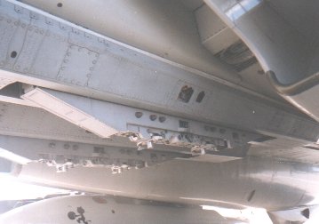 Photo Copyright Bill Hammond Bomb rack attached to NK 100 Roving Sands 97. Note rack is same color as A/C, glossy gull gray. No TER's or ordinance was seen on these racks on this particular day on any aircraft(VF 31 or 143).