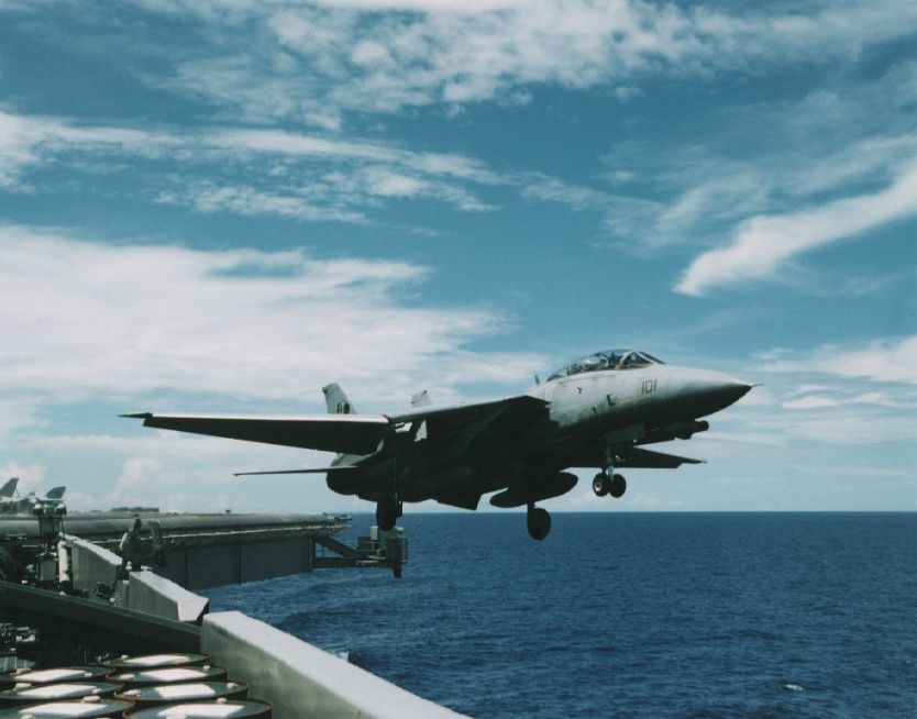 US Navy Photo by LT. J. Muse NK101 launches off a waist cat onboard USS Abraham Lincoln (CVN-72), 1998.