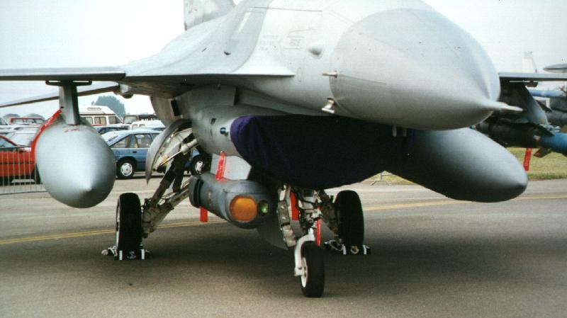 Close up of the LANTIRN targeting pod on a 510FS, 31 FW F-16C, showing the IR window to the left and the bordesighted laser designator to the right. AF:89-2050 "AV" 19th July 1997
