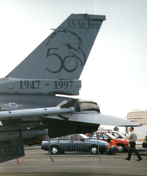 Close up of tail markings, showing the offical logo for the USAF's 50th Anniversary AF:89-2050 "AV" 19th July 1997