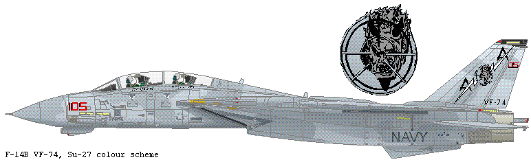 a VF-74 aircraft wearing an Su-27 style camouflage scheme. All VF-74 aircraft had a variation on