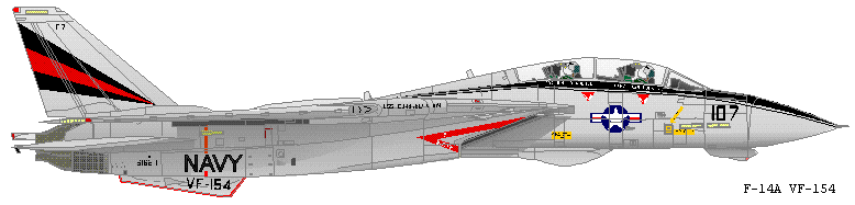 VF-154 finally transitioned to the F-14A beginning in October of 1983. Due to their late equipment the squadron received TARPS equipped F-14's from the start. The first cruise with the F-14A was in 1985 onboard the USS Constellation (CV-64), as part of CVW-14. Several further cruises onboard 'Connie' followed, with one taking place in 1987. This eventful cruise saw VF-154 operating around the Persian Gulf, intercepting Iranian P-3F's and conducting movements in the Gulf of Oman (at the so called "Gonzo" station").