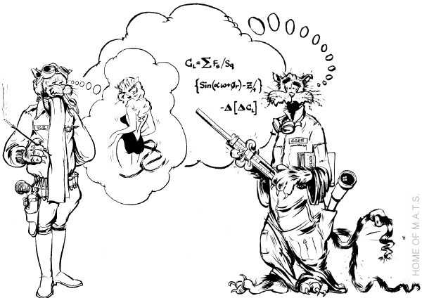 F-14A: The Beginning The cartoons shown below originally had been two single images. The cartoons were made by Grumman in the early '70s and were supposed to show that while TC (TomCat or the pilot) is dreaming of girls, GIBS (Guy In Back-Seat = the RIO) is thinking about getting the whole thing to work. This was always good for a laugh with F-14 aircrews. "Do the RIOs do all the work while the pilots just drive the thing?" It was good natured fun and a great "ice breaker" at NATOPS conferences. ![]() In case you wonder: The RIO's equation is the equation for the lift-coefficient and describes (simplified) the ratio of lift (generated by wings and fuselage) and lift-generating area ... |