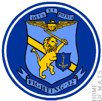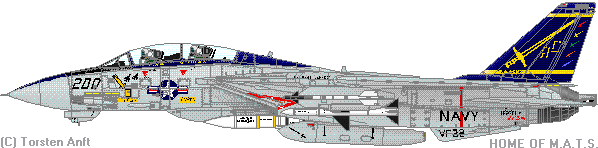 The VF-32 Swordsmen originated on 1 February 1945 as VBF-3, when VF-3 was split to form two sister squadrons. VBF-3 was assigned to Carrier Air Group 3 onboard USS Yorktown (CV-10) operating in the Pacific theater. Flying F6F-5 Hellcats, VBF-3 pilots became the first Navy carrier-based pilots to strike the homeland of the Japaneses Empire on 16 February. During the heavy action on that day, the squadron totaled 24 airborne kills of Japanese aircraft for which the Swordsmen were awarded the Preseidential Unit Citation. In 1946 VBF-3 transitioned to F8F-1 Bearcats and was redesigntaed VF-4A. Finally, in August 1948 the squadron was redesignated VF-32, the designation that it still bears today. At the outbreak of the Korean conflict, piltos of VF-32 were flying F4U-4 Corsairs aboard USS Leyte (CV-32). From October 1950 to January 1951, VF-32 participated in strikes against Korean targets including Wonsan Harbor, Puckchong, Chonjin, and Chosin Reservoir. Notewrothy during this period was an incident that occurred during a strike against the Chosin Reservoir on 4 December. ENS Jesse L. Brown, the first black Navy fighter pilot, was hit by anti-aircraft fire and forced down in North Korean territory. A squadron mate, Ltjg Hudner, landed his aircraft alongside ENS Brown and attempted to rescue him. His efforts were in vain. For his heroic effort, Ltjg Hudner was awarded the Congressional Medal of Honor and ENS Brown was awarded the Distinguished Flying Cross. After ooperations in Korea, the squadron returned to the East Coast where they became the first operational unit to fly the Grumman F9F-6 Cougar, the Navy's first swept wing jet fighter. VF-32 made subsequent deployments aboard USS Tarawa (CV-40) in 1953 and USS Ticonderoga (CV-14) in 1955. In 1956 VF-32 became the first US Navy squadron to receive the F8U-1 Crusader, in the process becoming the first supersonic squadron in the Navy. Nine years with the Crusader followed, till in 1965 VF-32 moved to the F-4B Phantom II. Finally in July 1974 VF-32 began to transition to the F-14A , the first East Coast squadron to make the change. Their first deployment with their new mount began in June 1975. During this cruise the squadron received the Adm. Joseph Clifton Award, signifying them as the best squadron in the Navy, an impressive achievement after only so short a time with their new equipment. 1979 saw VF-32 setting another record, the 19th of October saw the squadron complete 10 years of accident free flying and 17,000 accident free hours in the F-14. On these and almost all subsequent deployments VF-32 was partnered by VF-14. While the partner squadron was fairly consistent the air wing assignment changed several times:- on it's first cruise (and two subsequent) ones VF-32 was part of CVW-1 onboard USS John F.Kennedy (CV-67). In 1982 they moved to USS Independence (CV-62) for a cruise, after which the squadron started to receive the TARPS pod and suitably wired F-14's. This capability was extremely useful in the next cruise, again onboard USS Independence (CV-62), when it was used to provide high quality photo intelligence to support US forces in both Grenada and Lebanon. For this second cruise onboard USS Independence both VF-32 and VF-14 were moved to be part of CVW-6. A third Independence cruise was made between October 1984 and February 1985. At this point VF-32 moved air wings again, rejoining CVW-3 for a cruise onboard USS John F. Kennedy (CV-67). One notable event during this cruise was the first night barrier engagement by an F-14, presumably after the bird suffered problems with it's arrestor hook. The 1989 cruise onboard Kennedy saw the Swordsmen thrust into the limelight when two of their F-14A's engaged two Libyan MiG-23 Floggers. The 4th of January saw AC-202 (BuNo.???) and AC-207 (BuNo.159610) on Combat Air Patrol (CAP). The MiG-23's took off from Al Bumbaw airfield, Tobruk and began to close on the two F-14's. For several minutes the MiG's tried to maintain a bearing that would enable them to engage the F-14's, while the F-14's strove to disengage themselves without being forced to leave the area. However after several manoeuvres and confirmation that the MiG's were armed (using the F-14's Television Camera System (TCS)) it was decided the Libyans had shown hostile intent (although they had not actually fired) and so the Tomcats were cleared to engage. AC-202 turned in and fired a AIM-7 Sparrow, which failed to track. His wingman, in AC-207, also fired a Sparrow, which tracked and destroyed one of the MiG's, it's pilot successfully ejecting. AC-202 then closed to within AIM-9 Sidewinder range and managed to maintain a firing position. Once fired the Sidewinder continued to track and hit the MiG-23's rear fuselage. Again the pilot managed to eject successfully. With two MiG's splashed the F- 14's continued their patrol. The squadron's next call to combat was as part of the 1991 Gulf conflict, as part of CVW-17 onboard Kennedy. Once again the squadron's TARPS capabilities proved invaluable, providing pre and post strike pictures. One of the squadron's crews had the distinction of being the last Navy crew over Baghdad, five days after the cease-fire. Since Desert Storm VF-32 resumed Mediterranean deployments, at first with VF-14, later on by itself, after VF-14 was detached from CVW-17. The squadron has added air to ground missions to it's repertoire over the last few years. The Swordsmen's next deployment, onboard USS Theodore Roosevelt (CVN-71), began in late November 1996 and saw the first time that the Navy deployed digital cameras onboard carrier aircraft. The new cameras are fitted in the squadron's TARPS pods, replacing the KS-87 camera. These new Pulnix cameras can take up to two hundred digital images, being able to store them onboard or transmit them to appropriately equipped ground or sea based recievers at ranges of up to 300km. This new equipment gives the Tomcat a near "real- time" reconnaissance capability. As well