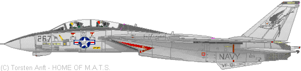 After VF-124 was disestablished in 1994 VF-101 took over its training role, creating a detatchment at NAS Miramar to train crews and ground personnel on the F-14A and D. The aircraft assigned to Miramar all had modex nos in the 200 series, while the Oceana unit used those in the 100 series. As nearly all West Coast F-14 squadrons have now moved to NAS Oceana the VF-101 detatchment has returned there too, moving back in September of 1996. Now all F-14 training, for all three variants is carried out at NAS Oceana, although VF-101 still maintains its NAS Key West detatchment for ACM training. The future will see VF-101 continuing to train the next generation of F-14 crews, with the training syllabus changing to accomodate the LANTIRN and NVG upgrades that are spreading throughout the fleet. F-14A ![]() F-14A ![]() |