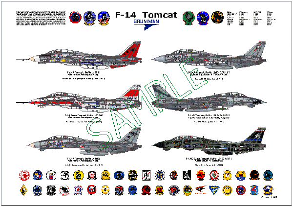 ![]() F-14 Squadron Print XXL This special high-quality multi-aircraft (professional ink-jet) print is available now! It is a 24 in x 16 in (alternative size: 11.7 in x 16.5 in = same price as Squadron Print) colour print including a brief history of the F-14 Tomcat, specifications for all three models in the fleet, logos of all squadrons that ever flew the F-14, 6 superb F-14 graphics showing the milestones of the Tomcat: