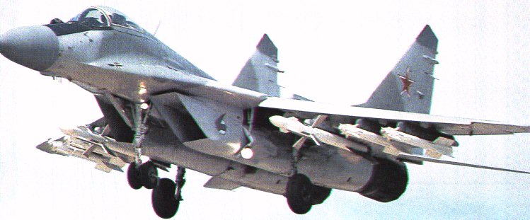 This Mig-29 is in full operational configuration for the air defense role, with AA-10 "Alamo" missiles inboard and AA-11 "Archers" on center and outboard pylons.