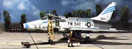 F-100 Super Sabre built by Joe Titus of Forth Worth, Texas. The marking are of the 23rd Tactical Fighter Squadron, 36th Tactical Fighter Wing, based in Bitburg, West Germany. The 1/48 scale kit and figure are from Monogram. |