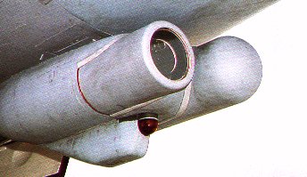 | Left : Externally, the F-14D can be distinguished from other variants by the General Electric / Martin -Marietta twin side-by-side sensor pods undernose, wich house the Northrop AN/AXX-1 TCS to starboard and the General Electric Aerospace Electronic System AN/AAS infra-red search and track sensor to port (seen here with a solid cover, perhaps indicating that the equipment is not fitted). These were ordered in 1993 for installation in 1996. Right : The boat-tail of an F-14D features the high-band AN/ALQ-165 RHAWS antenna and the fuel dump pipe. Bays for tandem chaff/flare dispensers are located just under the boat-tail. |