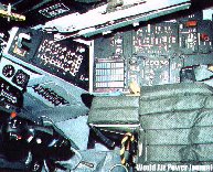 | The front cockpit of the F-14 Tomcat is typical of contemporary American layout, with a sense of order in a relatively small space. Dominating the forward panels is the square vertical display indicator screen, with the air combat manoeuvring panel above. The head-up display unit sits atop a flat portion of the console top rim. To the right of the VDI are dials covering acceleration and bearing distance heading among others, while at left indicators such as airspeed Mach # and radar altimetere. Side panels cover launch bar, landing gear and flap control at left and arrester hook, display control and elevation lead on the right-hand side. |