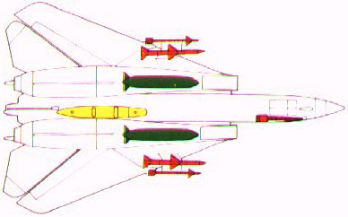 In 1980/81 a total of 49 Tomcats was modified to carry the Tactical Air Reconnaissance Pod System (TARPS) package, wich carries reconnaissance cameras and a large infra-red linescan system. This is the only shipboard reconnaissance platform currently available to the U.S. Navy. 1x20mm M61A1 six-barrel cannon 2xAIM-7M Sparrow 2xAIM-9M Sidewinder TARPS (in yellow) 2x1011 litres (267 U.S. gal) auxiliary fuel tanks |
