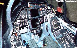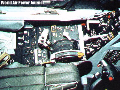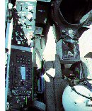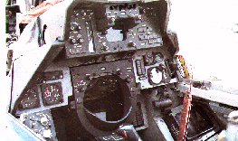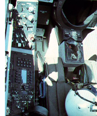 | The front cockpit of the F-14 Tomcat is typical of contemporary American layout, with a sense of order in a relatively small space. Dominating the forward panels is the square vertical display indicator screen, with the air combat manoeuvring panel above. The head-up display unit sits atop a flat portion of the console top rim. To the right of the VDI are dials covering acceleration and bearing distance heading among others, while at left indicators such as airspeed Mach # and radar altimetere. Side panels cover launch bar, landing gear and flap control at left and arrester hook, display control and elevation lead on the right-hand side. |