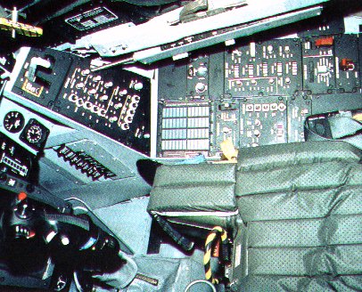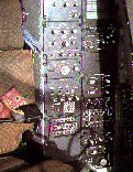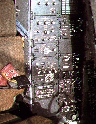 | The rear cockpit occupied by the Naval Flight Officer , has less instrumentation. The panel at the top is the detail data display panel, while the large circular housing incorporates the tactical information display unit. Threat advisory lights, fuel quantity totalizer, canopy jettison handle and bearing distance heading indicators are at top right of the TID. The large panel at far left covers armament operations. The side consoles are quite large and cover a variety of items such as ECM, IFF transponder control , communications and eject command control. |